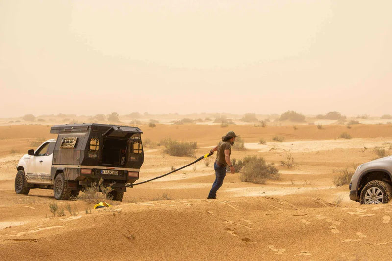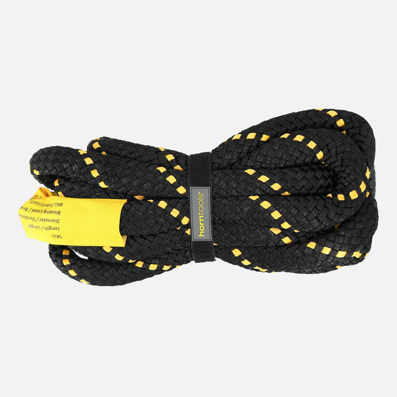 Kinetische Bergeseile sind besonders geeignet, um festgefahrene Fahrzeuge zu bergen. Das Seil dehnt sich zunächst und zieht sich dann wieder zusammen. So gibt es nicht den typischen Ruck beim Anfahren und das Material wird geschont. Gleichzeitig kann das Bergefahrzeug mit Anlauf anfahren und somit viel größere Lasten ziehen. Das kinetische Bergeseil von horntools hat beidseitig extra starke Schlaufen, die mit Polyurethane beschichtet wurden.