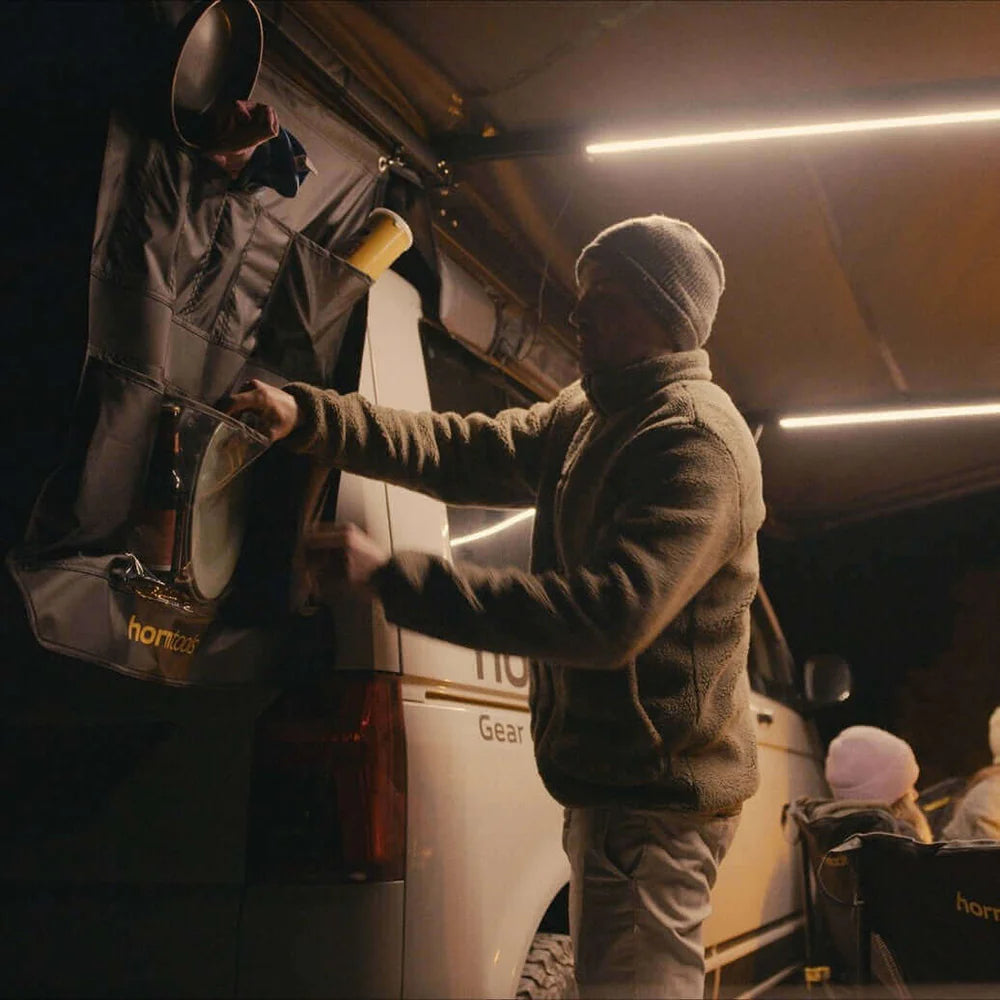 Der schwarze Organizer ist mit Taschen in verschiedenen Größen und Formaten ausgestattet und schafft Ordnung und Stauraum auf deinen Camping & Overlanding Abenteuern.