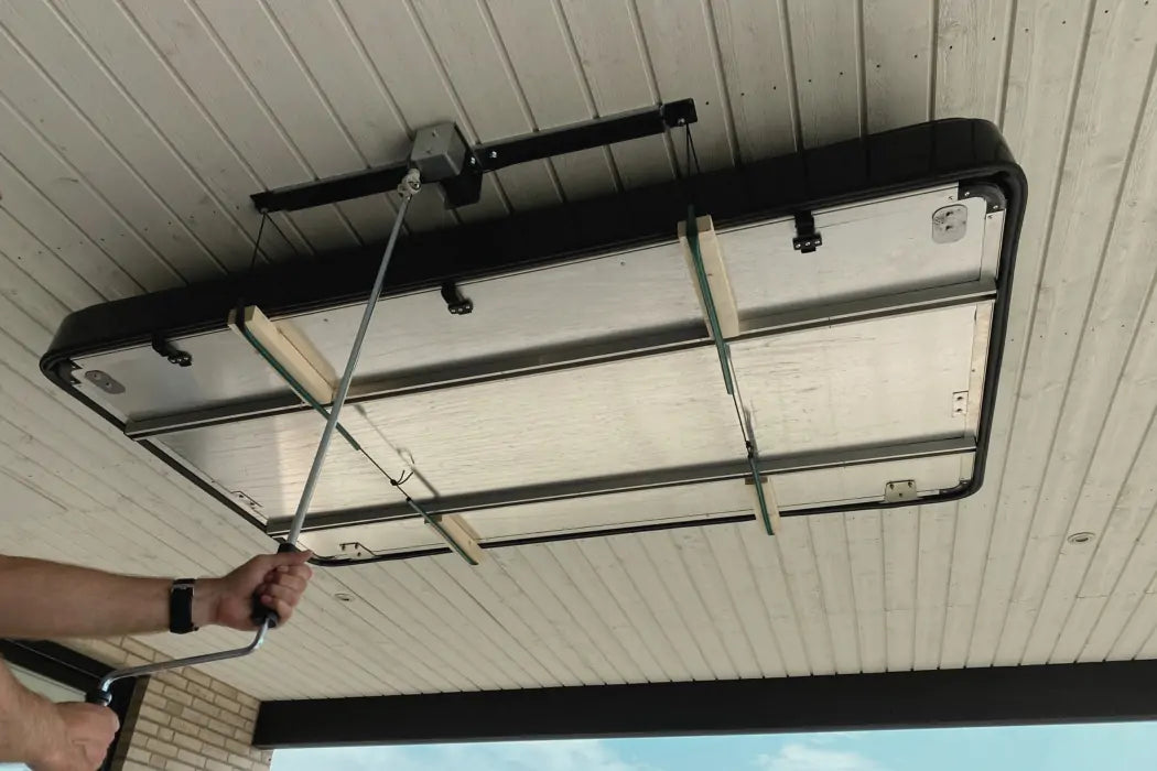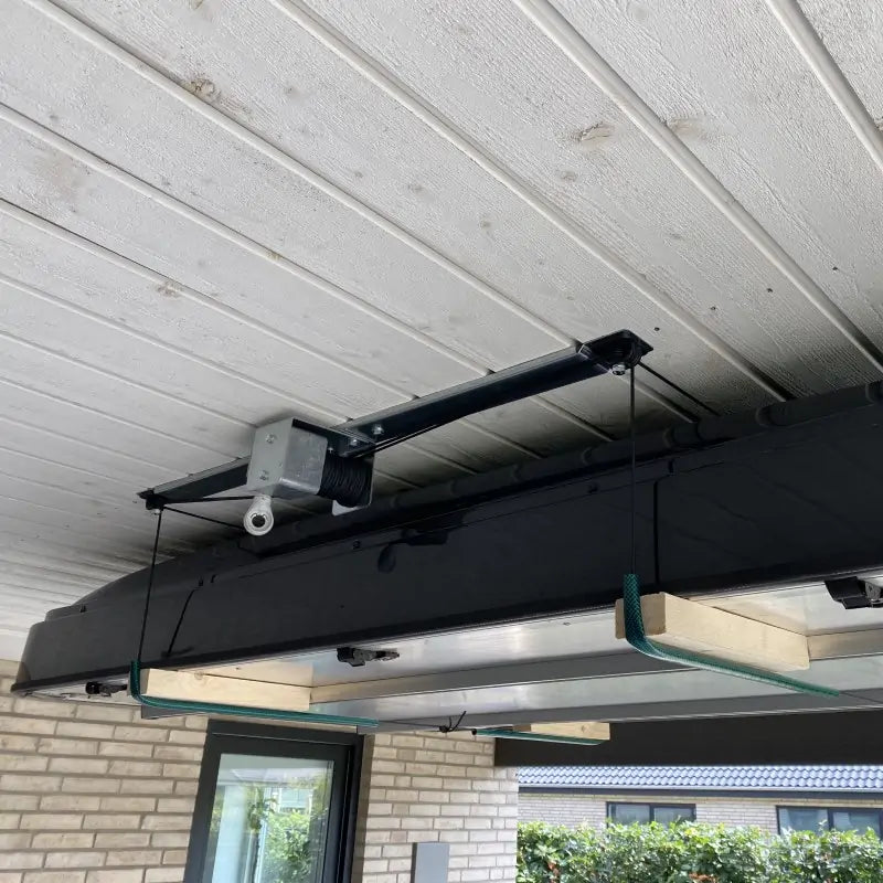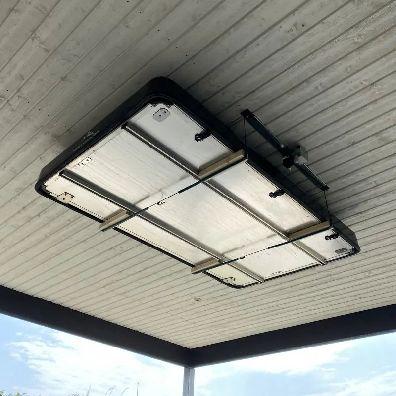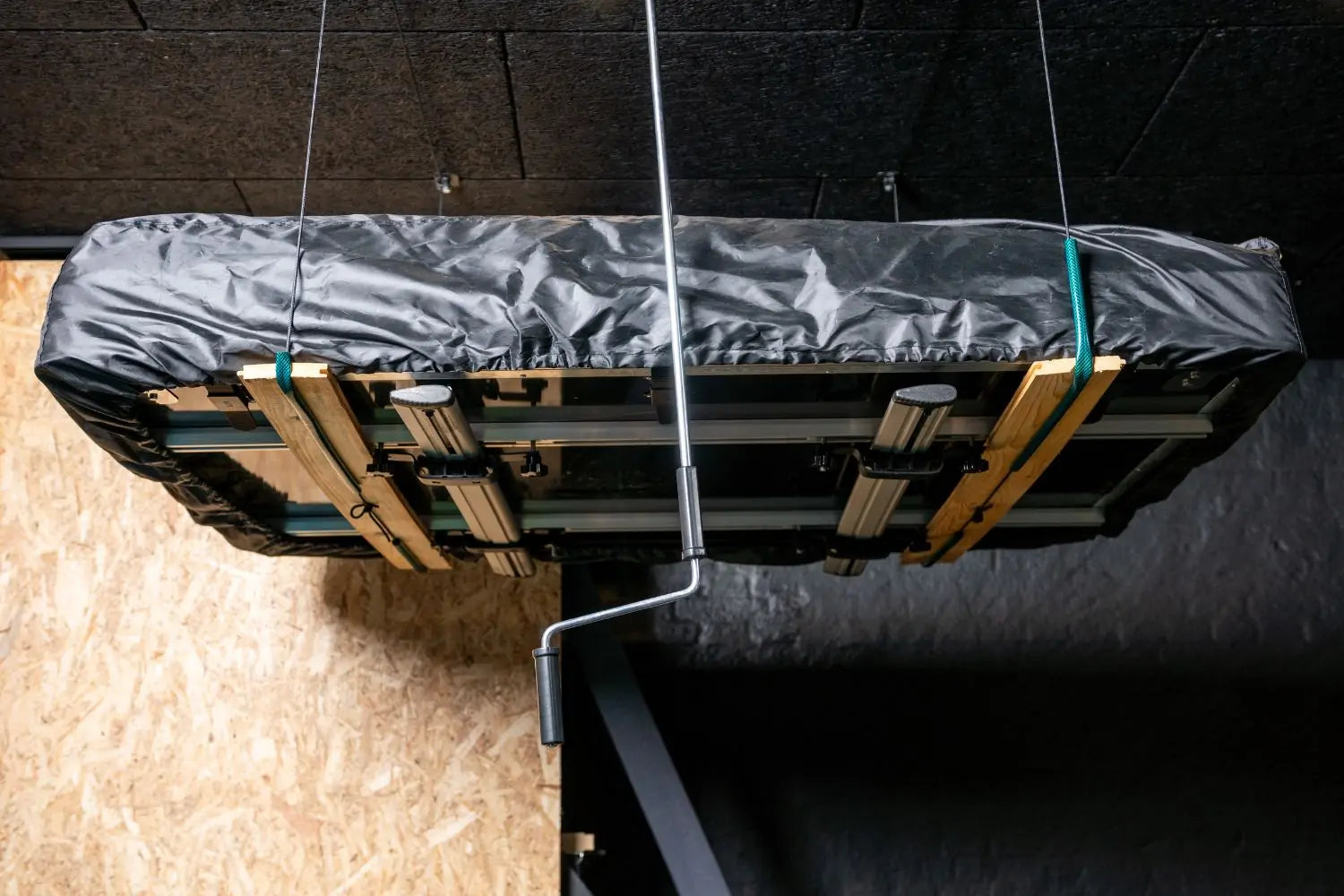 Mit dem Zeltlift können Sie Ihr Dachzelt ganz einfach selbst auf- und abbauen und haben einen guten Platz, um das Dachzelt zu verstauen, wenn es nicht gebraucht wird. Der Zeltlift hebt das Zelt unter die Decke Ihres Carports oder Ihrer Garage, wo es gelagert werden kann. Es ist auch möglich, das Zelt komplett auf den Boden abzusenken, um das Dachzelt zu reinigen oder zu trocknen. Passend für die meisten Dachzelttypen. Es wird empfohlen, einige Holzklötze zu verwenden, um Abstand zwischen dem Kabel und der Hartschale zu schaffen. (nicht im Lieferumfang enthalten)