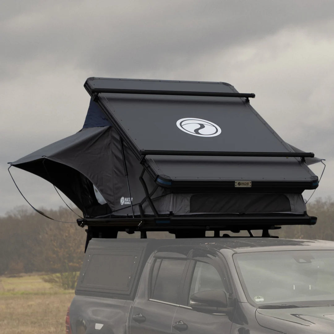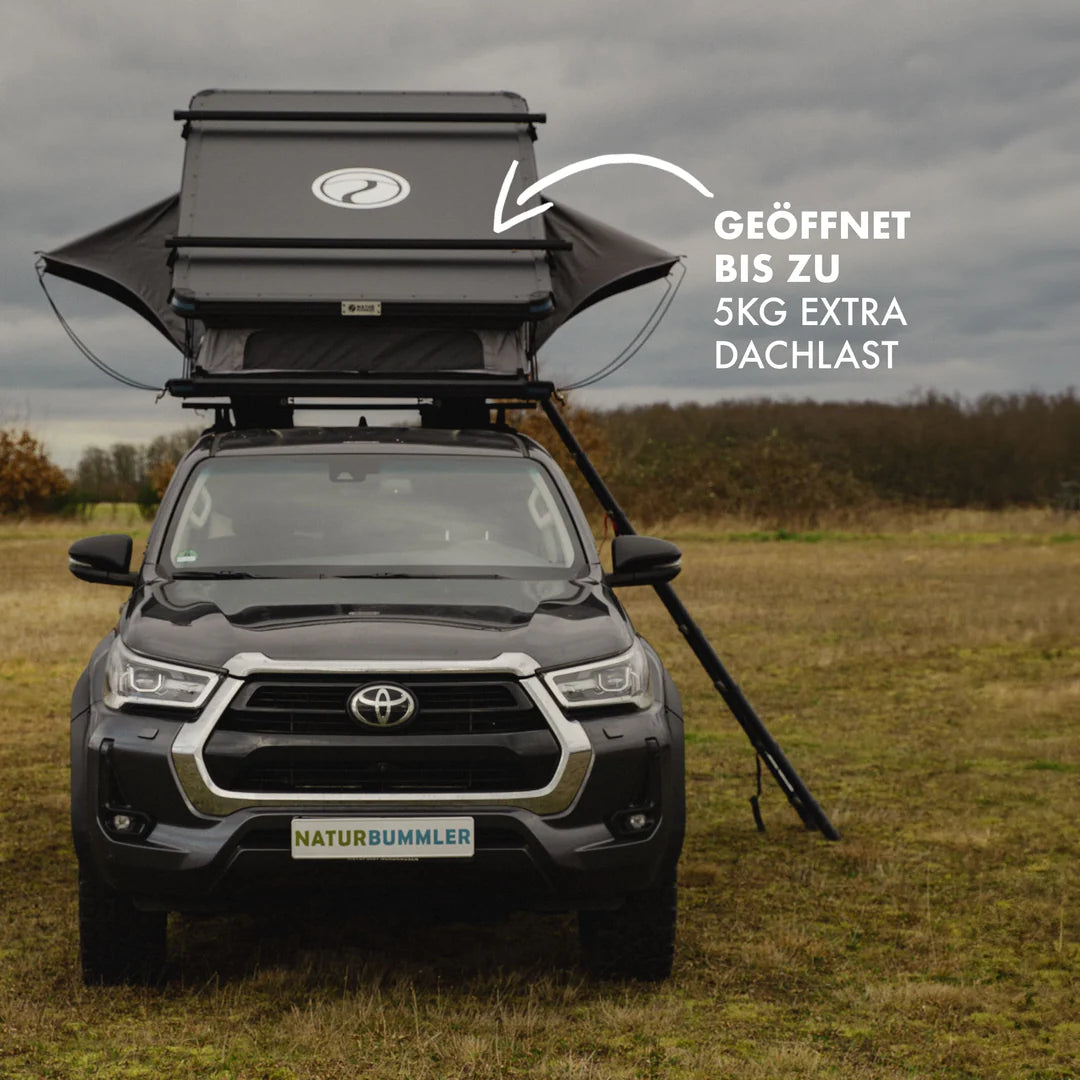 - Durch die Verwendung von Aluminium für die Hartschalen und weiteren Metallen für Gelenke und Schnallen, sowie auch den hochwertigen Gasdruckfedern ist das Dachzelt sehr robust. Auf diese Weise können auf die Dachträger des Zeltes noch 7kg im geöffneten Zustand und 30 kg im geschlossenen Zustand zugeladen werden (z.B. für Solarpanels, Surfausrüstung, Fahrrad usw.).