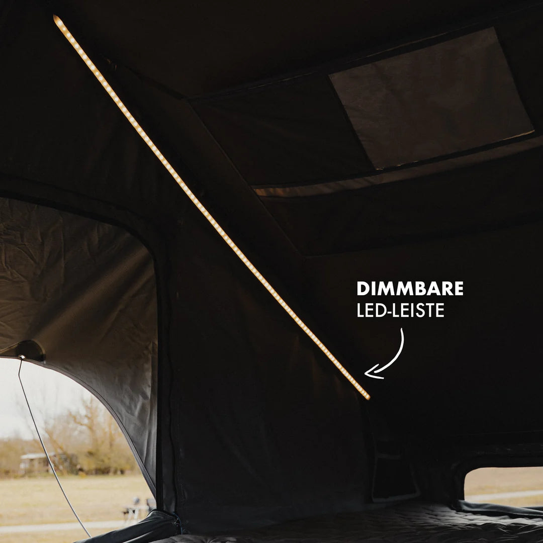 - Integrierte LED-Leiste: Für gemütliche Nächte im Dachzelt ist eine LED Leiste angebracht, an die eine Powerbank per USB angeschlossen werden kann.