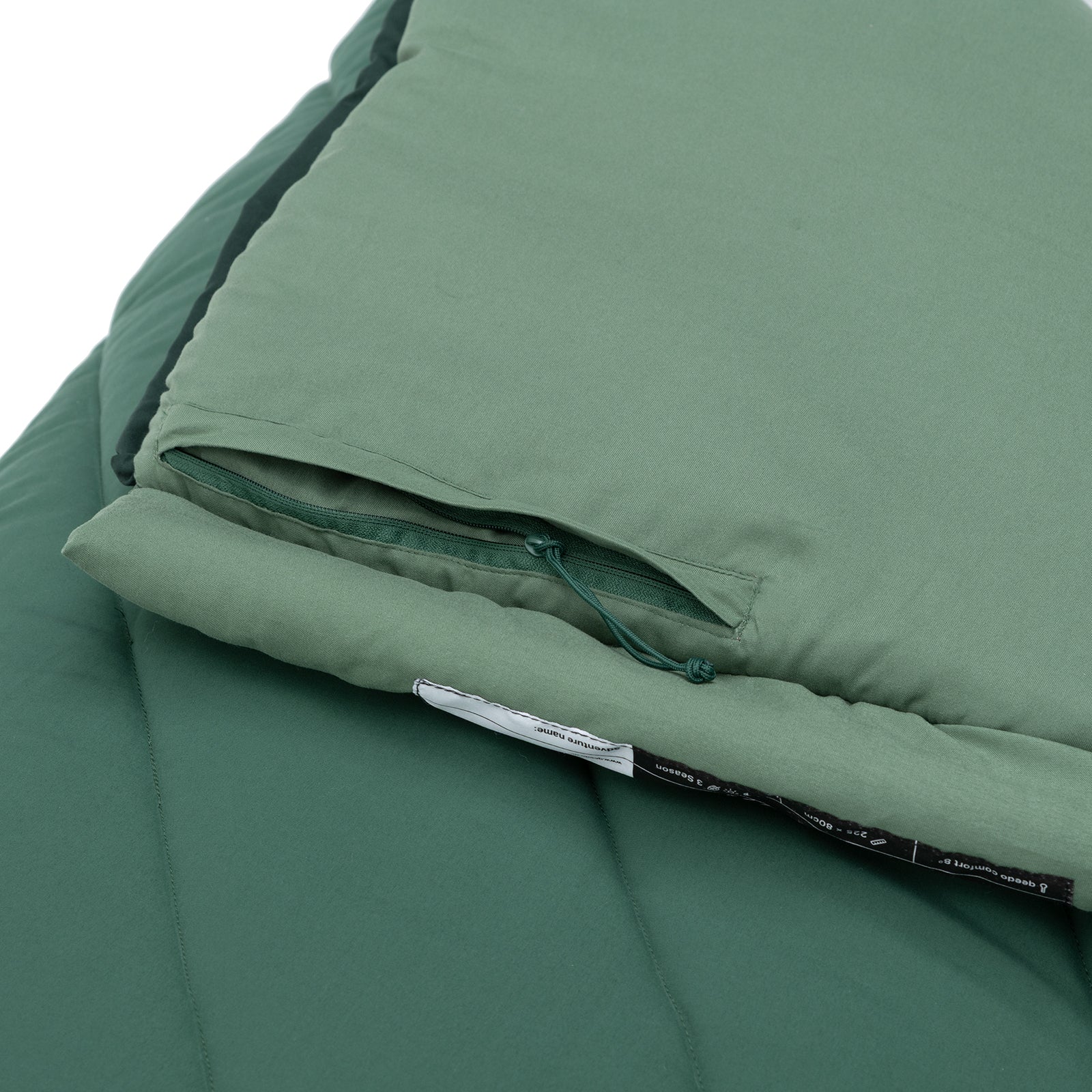 Weicher, eiförmiger Schlafsack für 3 Jahreszeiten mit einer Temperaturempfehlung von 8 – 25°C aus raschelfreiem und wasserabweisendem Material.