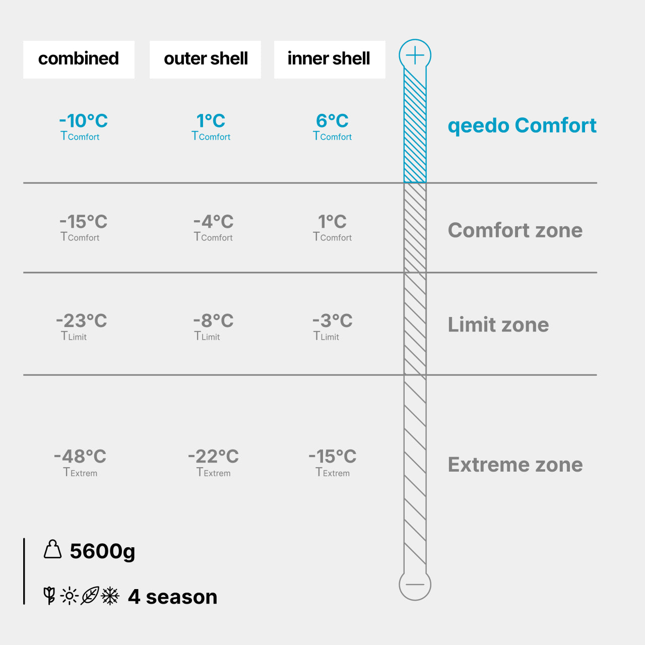 Die Temperaturangaben basieren auf genormten Labortests – sie dienen zur Orientierung, weichen aber je nach Person und Situation ab. Deshalb haben wir zusätzlich eine praxisnahe qeedo Komforttemperatur definiert: -10 °C. Sie berücksichtigt typische Outdoor-Bedingungen und das durchschnittliche Wärmeempfinden – damit du verlässlicher planen kannst.