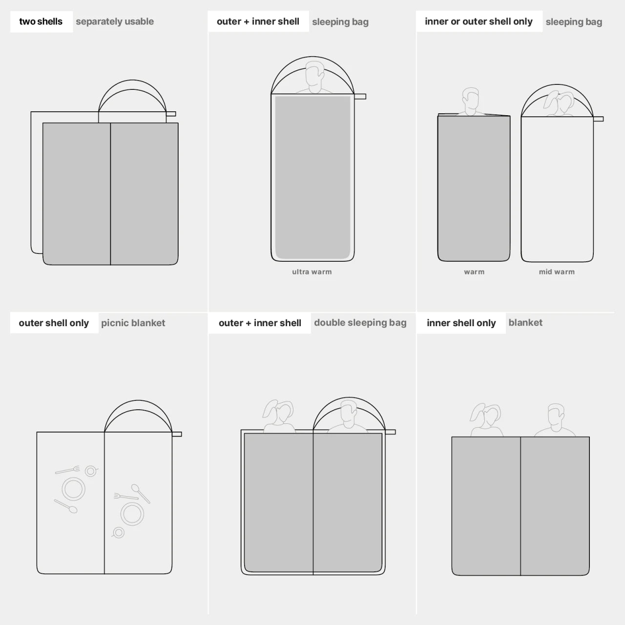 Der Fellow hat zwei Hüllen, die separat genutzt werden können. Einfach auszippen und schon hat man zwei Schlafsäcke oder eine Decke.