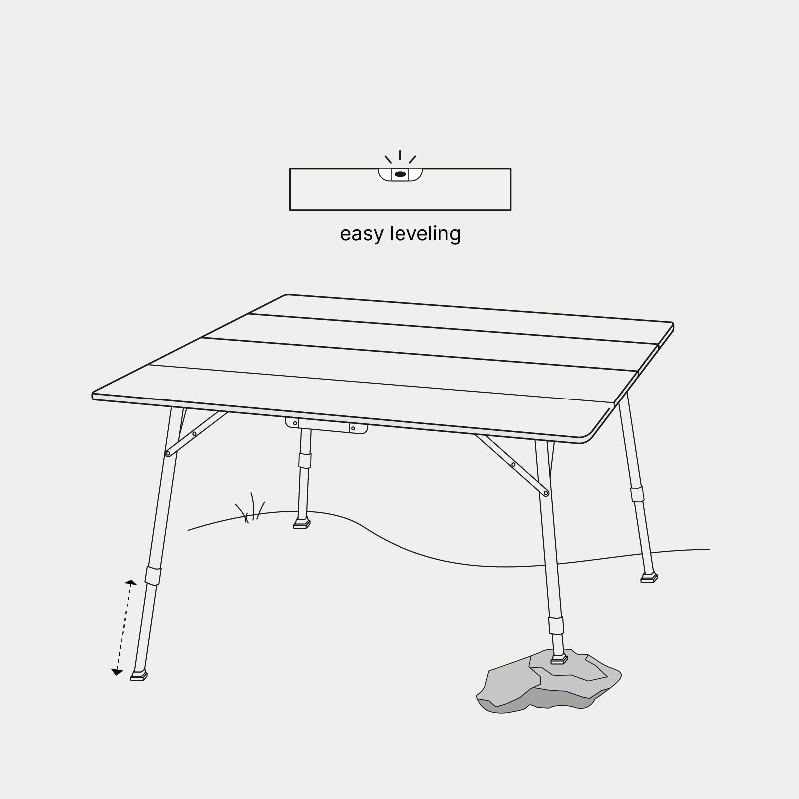 Mit diesen Features macht qeedo dein Abenteuer leichter: Der Campingtisch aus Bambus ist höhenverstellbar, sehr robust, hat justierbare Standbeine und stabile Scharniere.