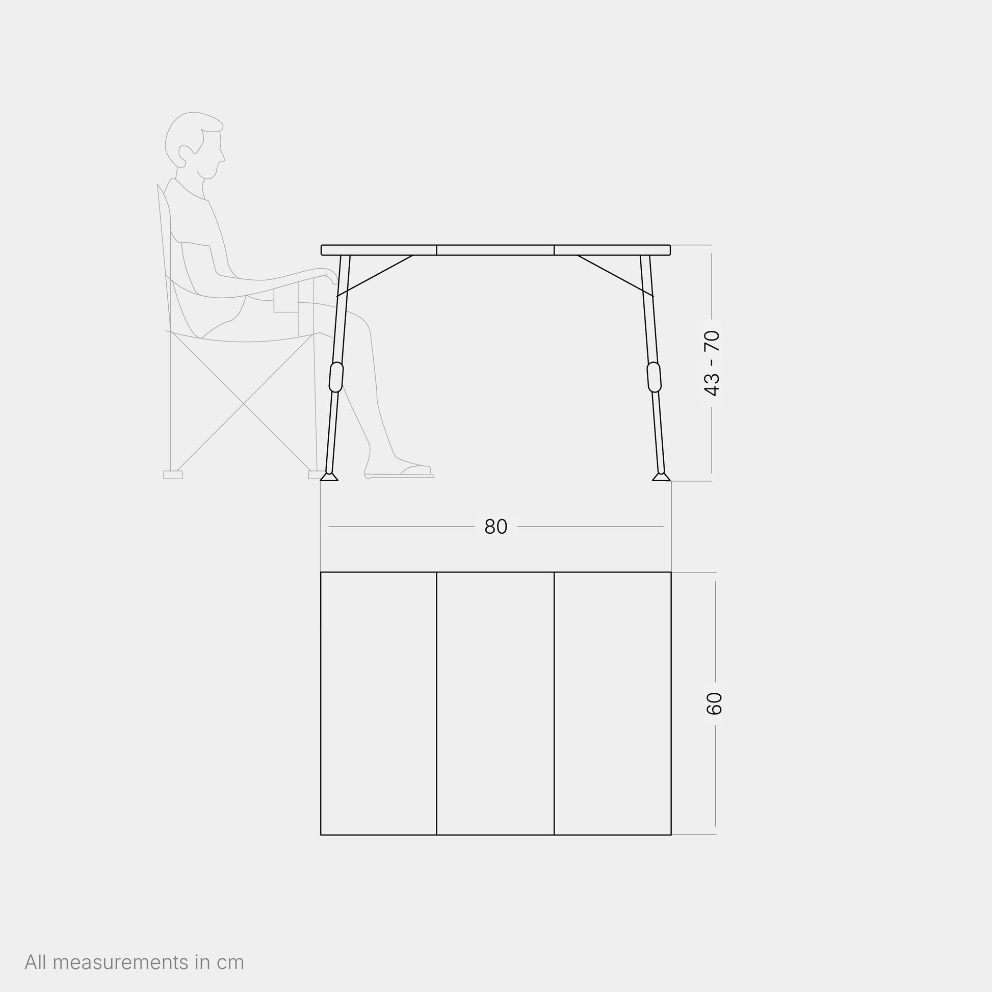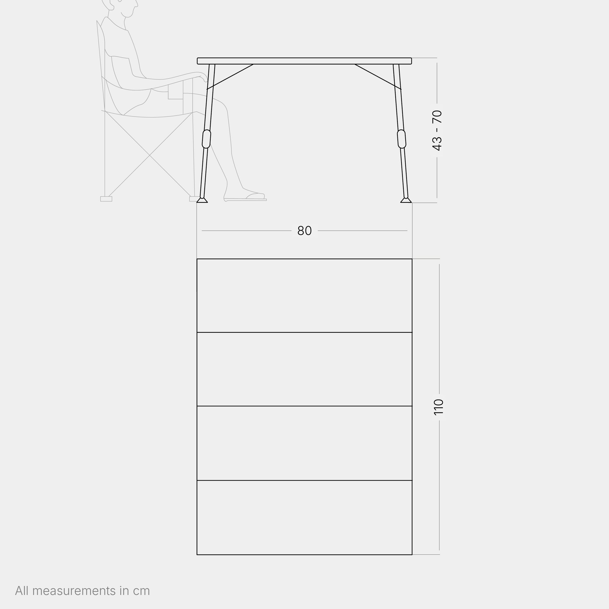 Die vier Tischbeine lassen sich stufenlos in der Höhe zwischen 43 - 70 cm verstellen. Über ein Zahnstangensystem lassen sich die einzelnen Beine individuell justieren und ordentlich fixieren.