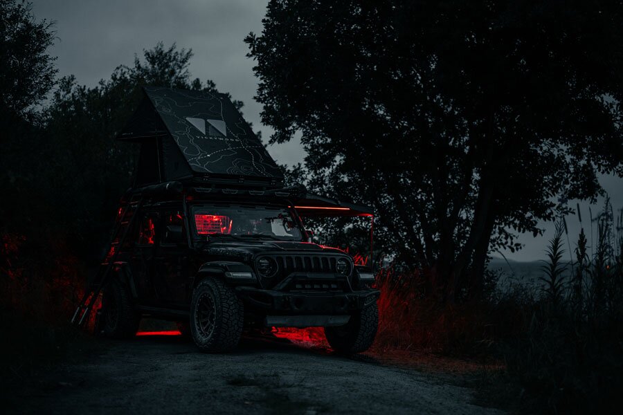 Rotes LED-Licht schont deine Nachtsicht und bewahrt dir die Augenanpassung an Dunkelheit – ideal bei Nacht am Campingplatz oder unter freiem Himmel. Es zieht weniger Insekten an als grelles Weißlicht und stört weder deinen Schlaf noch deine Mitcamper. Genau deshalb verbauen wir in unseren 180° und 270° Markisen eine rote LED-Beleuchtungsoption – für angenehmes Nachtlicht, bessere Abendstimmung und mehr Komfort beim Camping & Overlanding.