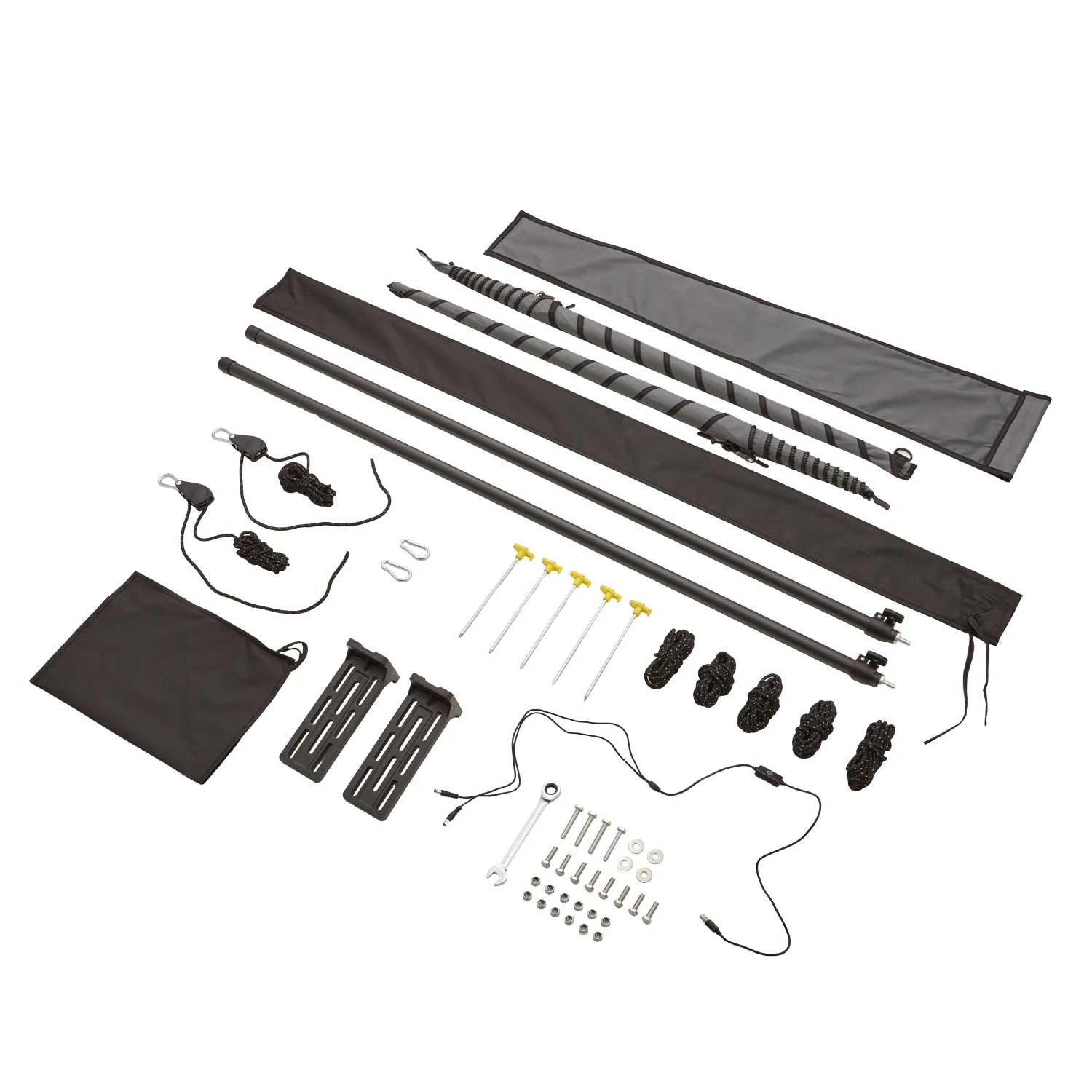 - Inklusive Organizer, Teleskopstangen, Seilspanner & Universal-Montagematerial