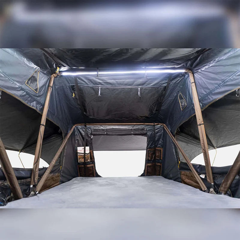 Ambiente im Dachzelt: Die LED-Leuchten sind im Innenraum des Dachzelts integriert und können bequem per dimmbarem Schalter bedient und zwischen drei unterschiedlichen Farbtönen hinundher geschaltet werden.