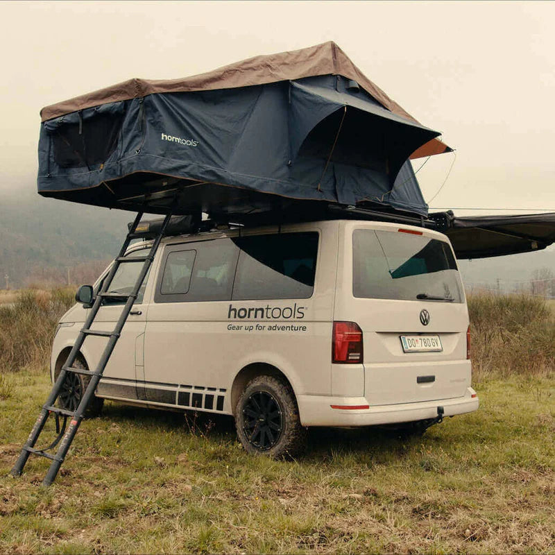 Die neue Teleskopleiter erlaubt bequemes Auf- und Zuklappen des Dachzelts. Sie kann in der Länge je nach Bedarf eingestellt werden und ermöglicht optimales Hinauf- und Hinuntersteigen.