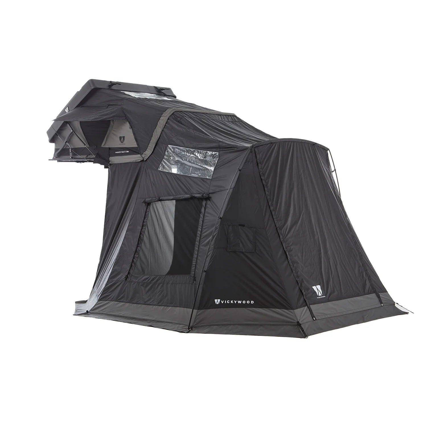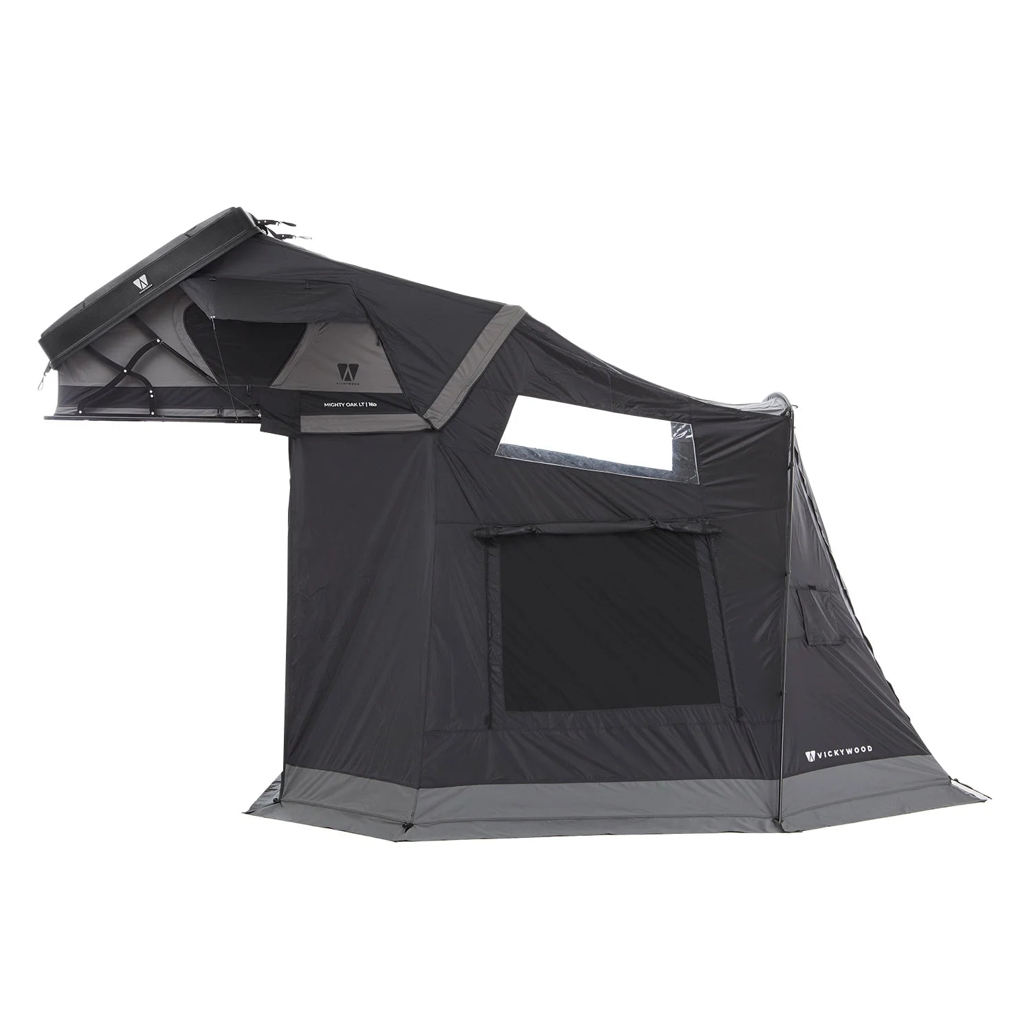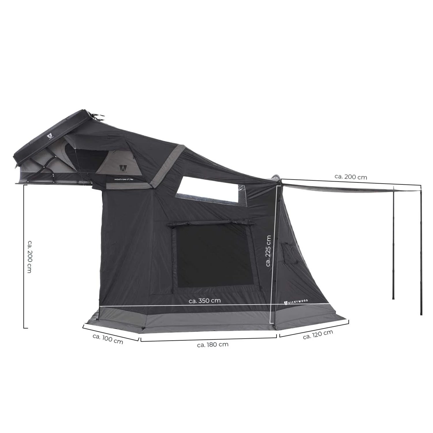 Erweitere dein Setup mit dem geräumigen Vorzelt und genieße trockenen Zugang zum Dachzelt sowie zusätzlichen geschützten Platz zum Kochen, Verstauen oder Entspannen.